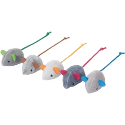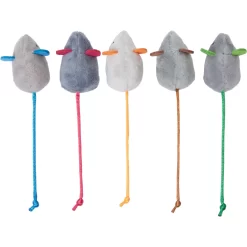 Frisco Basic Plush Mice Cat Toy with Catnip, 5 count — This mousy crew packs triple the fun for cats everywhere—a fuzzy texture to grab and bite, string tails to chase, and an infusion of Canadian catnip to go wild over! Toss these around to get cats chasing and batting after them, or carrying them around as their playtime “prey”.