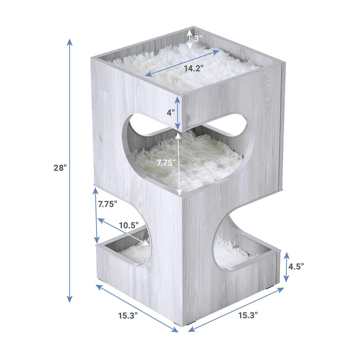 - 28-inch tall cat tree helps satisfy your cat’s core needs at home—enrichment, privacy, comfort and elevated spots for napping and lounging.
