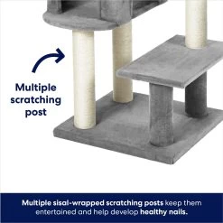 - Extra-tall scratching posts make it easy for cats to scratch and stretch, with built-in toys for batting and swatting action.