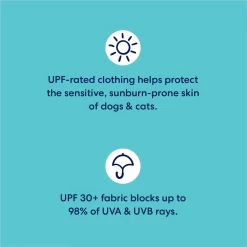 - The Ultraviolet Protection Factor (UPF) of the sun-protecting fabric blocks 98% of the harmful UVA/UVB rays, allowing sunburn-prone cats and dogs to enjoy the sunshine.